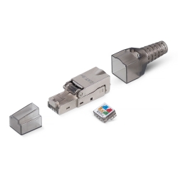 Экранированный разьем RJ 45 категории 6А. Разъем RJ45 подходит для промышленных сред, которые требуют высокую производительность для передачи цифровых сигналов данных до 10GbE. Он используется в нескольких приложениях, наиболее часто для телекоммуникационных сетей Ethernet, IP наблюдения, автоматизации производства и управления. Корпус выполнен с металла, заделка кабеля происходит через IDC контактную группу без использования инструмента.