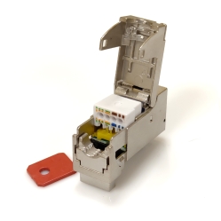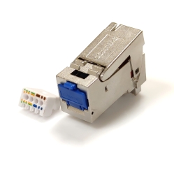 Модуль самозажимной кат 6а FTP KeyStone для компьютерных розеток и патч-панелей используется при расключении экранированной витой пары на разъем форм-фактора RJ-45. Подключение витой пары происходит по цветовым схемам T568A или T568B. На лицевой стороне расположен разъем на 8 пин для подключения коннектора от патч-корда. На тыльной стороне расположен коннектор IDC типа (insulation displacement contact – монтаж с прорезанием изоляции) в который подводятся 8 жил витой пары и зажимаются между медными сужающимися ножами модуля с помощью зажимной крышки усилиями пальцев руки. Для монтажа достаточно использовать кусачки для удаления излишков жил витой пары. После расключения кабеля, модуль устанавливается в пластиковую или металлическую рамку розетки или патч-панели с крепежной планкой Keystone (IEC 60603-7). Модуль RJ-45 категории 6a рассчитан на скорость передачи 10 Гбит/с и подходит для питания через Ethernet (PoE). Металлический корпус поддерживает возможность подключить экранированный кабель.