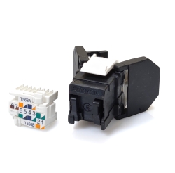 Черный модуль самозажимной Corning кат 6 UTP для компьютерных розеток и патч-панелей используется при расключении неэкранированной витой пары на разъем форм-фактора RJ-45. Подключение витой пары происходит по цветовым схемам T568A или T568B. На лицевой стороне расположен разъем на 8 пин с защитной шторкой от пыли, предназначенный для подключения коннектора от патч-корда. На тыльной стороне расположен коннектор IDC типа (insulation displacement contact – монтаж с прорезанием изоляции) в который подводятся 8 жил витой пары и зажимаются между медными сужающимися ножами модуля с помощью зажимной крышки усилиями пальцев руки. Для монтажа достаточно использовать кусачки для удаления излишков жил витой пары. После расключения кабеля, модуль устанавливается в пластиковую или металлическую рамку розетки или патч-панели с крепежной планкой Keystone (IEC 60603-7). Модуль RJ-45 категории 6 рассчитан на скорость передачи 1 Гбит/с и подходит для питания через Ethernet (PoE). Пластиковый корпус не поддерживает возможность подключить экранированный кабель.
