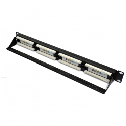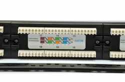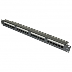 Патч-панель кат.5е UTP устанавливается в серверный шкаф или стойку и используется для подключения витой пары со стороны точки коммутации с активным сетевым оборудованием. Установочная высота 1U в направляющие 19 дюймов на четыре точки крепления. Основание панели изготовлено из стали с пластиковыми вставками под коннекторы RJ-45. Подключение заземления не предусмотрено, патч-панель неэкранированная.