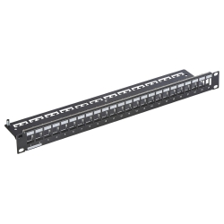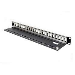 Модульная патч-панель 19″ 24 порта KeyStone – одна из составных частей структурированной кабельной системы (СКС), предназначена для расключения витой пари со стороны точки коммутации, например в серверном шкафу или коммутационной стойке. Патч-панель изготовлена из алюминия и покрашена порошковой краской. Конструкция предусматривает кабельный органайзер для фиксации 24 кабелей витой пары пластиковыми стяжками. На основании корпуса предусмотрен вывод для подключения заземления. Для неиспользуемых портов под модули предусмотрены черные пластиковые заглушки с креплением формата KeyStone (опционально). На лицевой части предусмотрено место для маркировки портов.