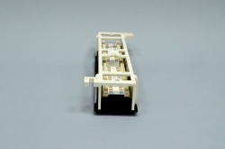 На тыльной стороне расположена плата, на которой установлены пластиковые модули с медными ножами для расключения витой пары методом «забивки». Нанесена цветовая схема A и B. Кабельный организатор не предусмотрен, витая пара подводится и крепится пластиковыми стяжками к основанию патч-панели одна поверх другой, образуя пучок в 12 линков.