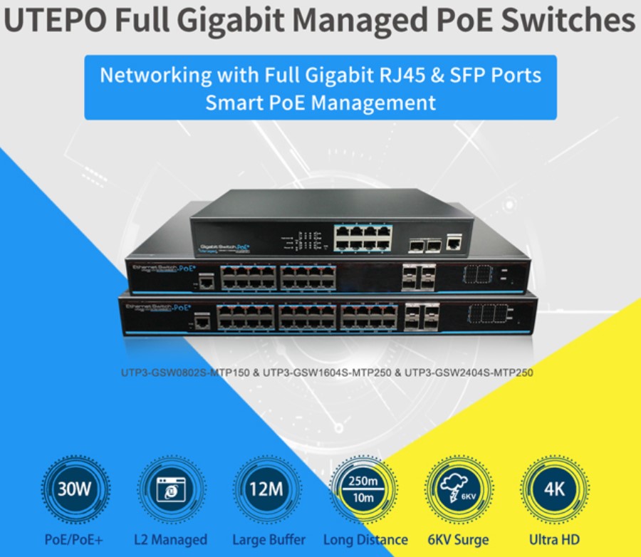 Полноценные гигабитные управляемые PoE-коммутаторы UTEPO оснащены высокопроизводительной аппаратной и программной платформой нового поколения, большим буферным чипом и обширной функцией управления L2 (QVLAN, QoS, IGMP Snooping, Fast-Ring, PoE). Могут использоваться для мониторинга безопасности предприятия, промышленного парка и в других решениях.