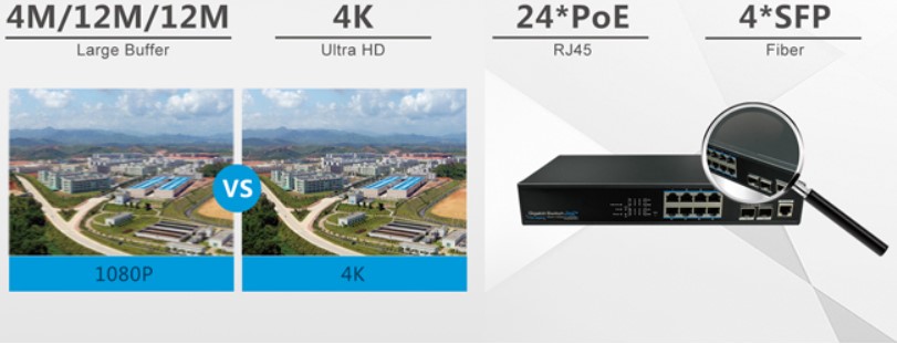 Серия включает 8/16/24 канальные устройства Downlink линии, (10/100/1000М) с поддержкой PoE, и с 2/4/4 каналами SFP Uplink линии, большой буфер 4M/12M, коммутаторы отвечают требованиям для 4K систем видеонаблюдения.