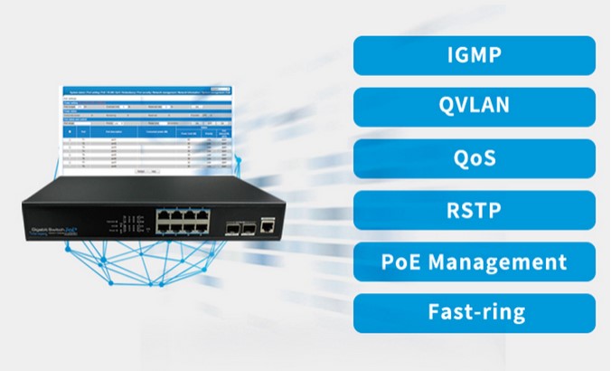 Поддержка функции управления 2-уровня, включая QVLAN, QoS, IGMP, RSTP, Fast-Ring, аутентификацию 802.1X, управление PoE.