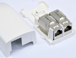 Розетка служит для физического окончания (терминирования) кабеля на рабочем месте. Представляет собой пластмассовую коробочку для монтажа на стену либо другую ровную поверхность с помощью саморезов . В розетку крепится два модуля формата KeyStone для подключения патч-корда с коннектором RJ-45.