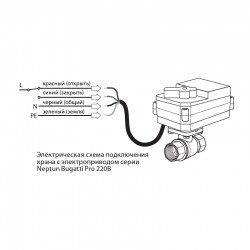 Универсальный шаровый кран с электроприводом Neptun Bugatti Pro 220В 1" предназначен для перекрывания подачи воды в системах инженерных коммуникаций. На корпусе крана предусмотрен рычаг, позволяющий перекрыть воду вручную, например при отключенной электроэнергии. Корпус электропривода выполнен из нетоксичного ударопрочного поликарбоната, выдерживающего температуру до 120 °C.