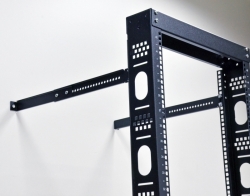 Комплект крепления стойки к стене применяют для увеличения вертикальной устойчивости однорамных стоек. Рекомендуется использование в случае долгосрочной установки серверной стойки или при установке оборудования глубиной более 300 мм. Для фиксации к кирпичной/бетонной стене используют металлические анкера, для гипсокартона рекомендуется использовать распорные дюбеля Молли. К раме стойке фиксаторы крепятся в пазы юнитного крепежа высотой 1U (1 юнит), расположенного на боковой части вертикальных направляющих.